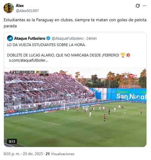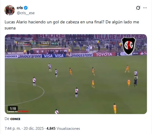 Ya sobre el final, el Pincha volvió a hacer uso de la pelota parada, una especialidad de la casa, y encontró la ventaja definitiva. Nuevamente, el Pipa Alario fue el autor de otra conquista y los usuarios en las redes sociales, especialmente los de River Plate, recordaron sus épocas gloriosas en el Millonario.