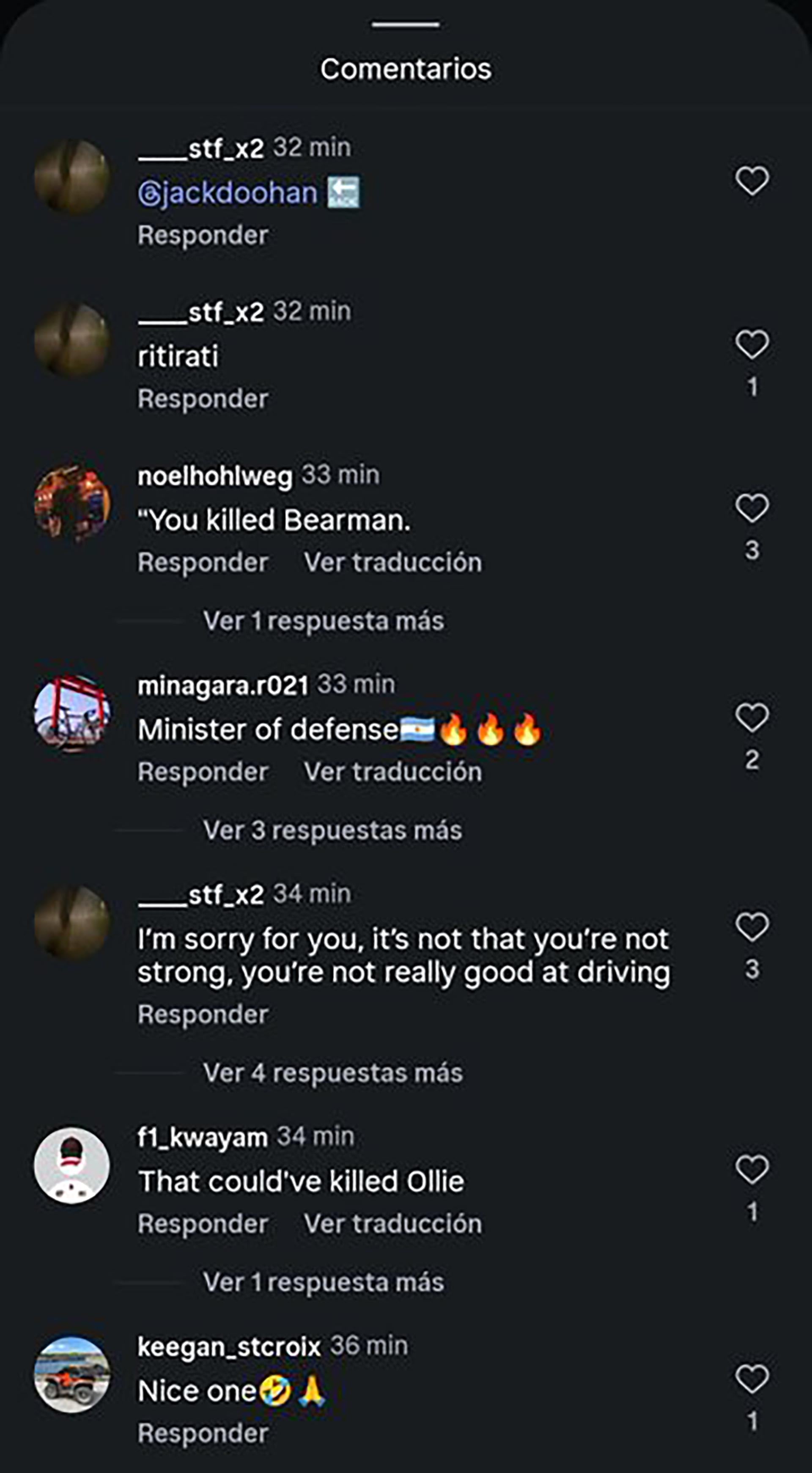 Seguidores del inglés inundaron su cuenta de Instagram con mensajes como “Tentativa de homicidio”, “Por qué no fuiste tú el que se embarró en la pared con tu maniobra”, “Estúpido”, y “Mataste a Bearman”. Otro comentario apuntó: “¿Por qué ampliaste la trayectoria, obligando a Bearman a ir hacia la hierba y provocando que se estrellara?”. Estas expresiones reflejaron el nivel de hostigamiento que recibió Colapinto tras el accidente.