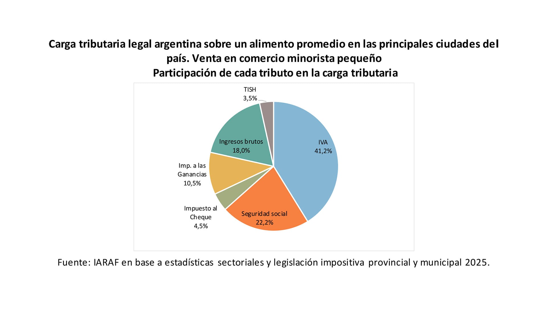 Comprar alimentos en la Argentina significó, durante 2025, afrontar una carga impositiva elevada incluida directamente en el precio final. Según un informe del Instituto Argentino de Análisis Fiscal (IARAF), la carga tributaria legal argentina sobre un alimento se ubicó entre el 42% y el 43% del valor que paga el consumidor en las principales ciudades del país. El dato surgió del análisis de la legislación vigente en los tres niveles de gobierno y permitió identificar qué impuestos y aportes explicaron esa porción del precio.