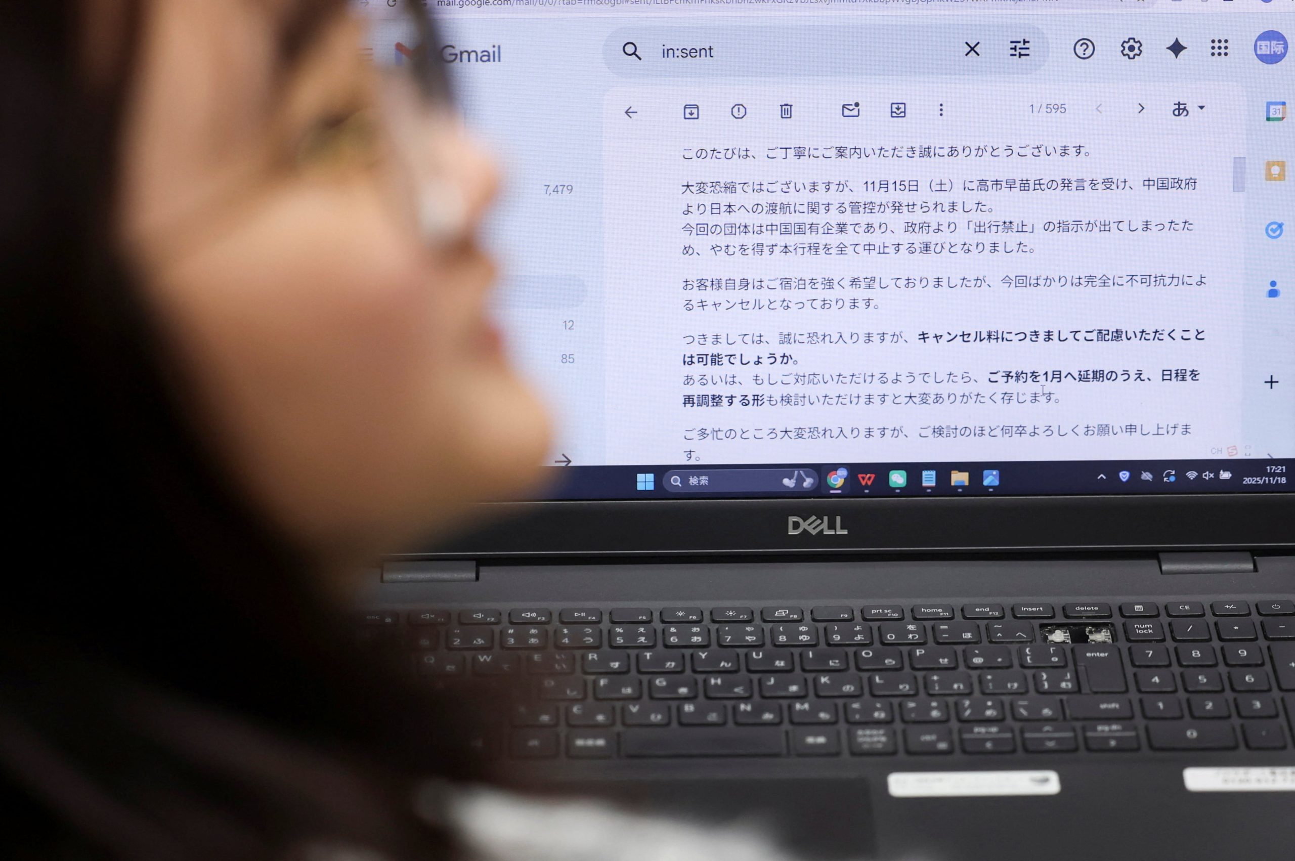 Una pantalla muestra un correo sobre cancelaciones de reservas en una agencia de viajes de Tokio, ante la creciente tensión entre China y Japón. (REUTERS/Issei Kato)