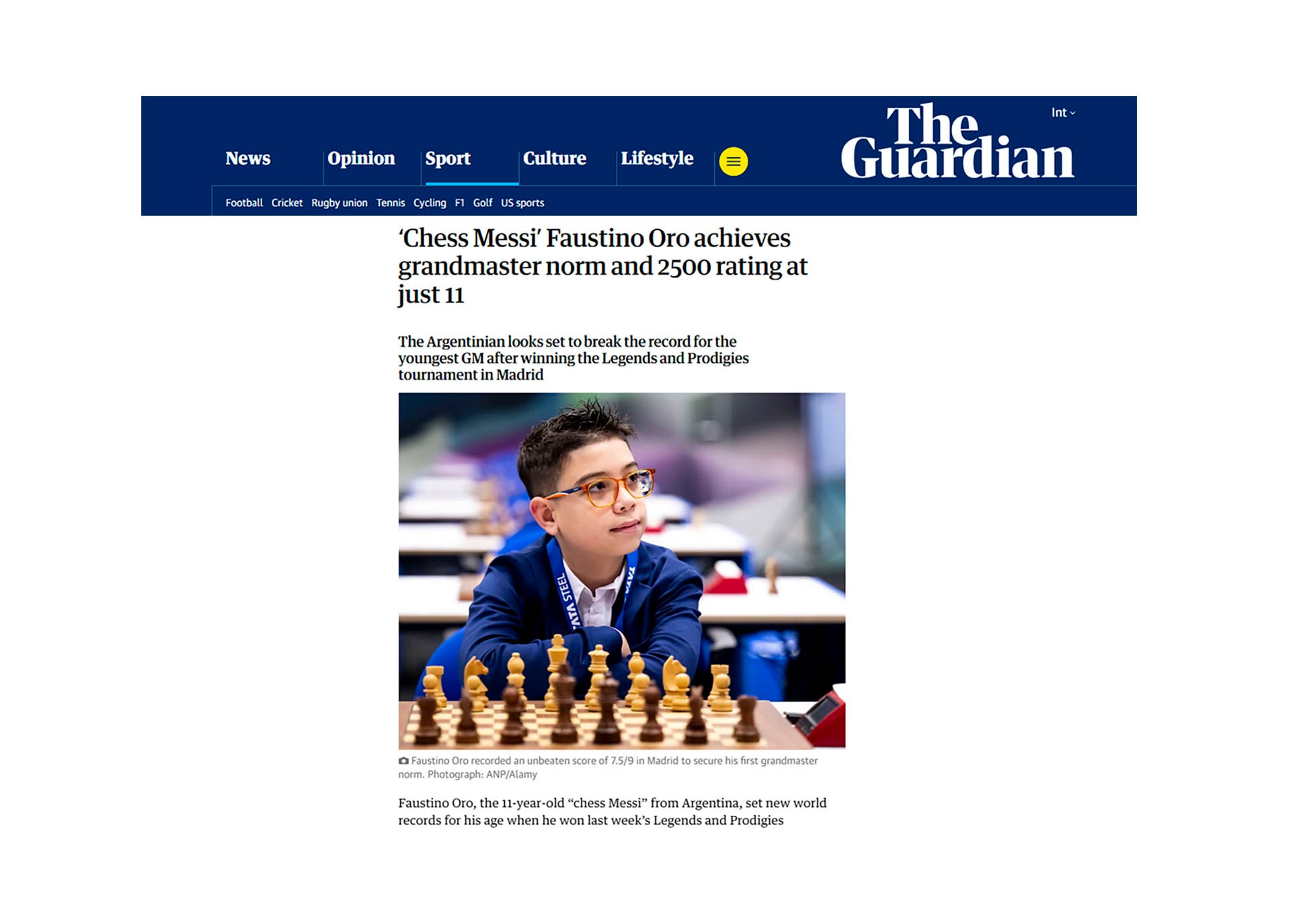 La irrupción de Faustino Oro en el mundo del ajedrez internacional ha llamado la atención de la prensa mundial. El joven prodigio argentino consiguió la primera norma de gran maestro y superó la barrera de los 2500 puntos de rating FIDE con solo 11 años (el próximo 14 de octubre cumplirá 12 años). Este hito ya lo ubica en un lugar privilegiado en la historia del deporte, además de encaminarlo hacia la posibilidad de transformarse en el gran maestro más joven de la historia. Su impactante irrupción lo llevó al ojo público a nivel mundial y el tradicional diario británico The Guardian dedicó un extenso artículo para analizar su desempeño.