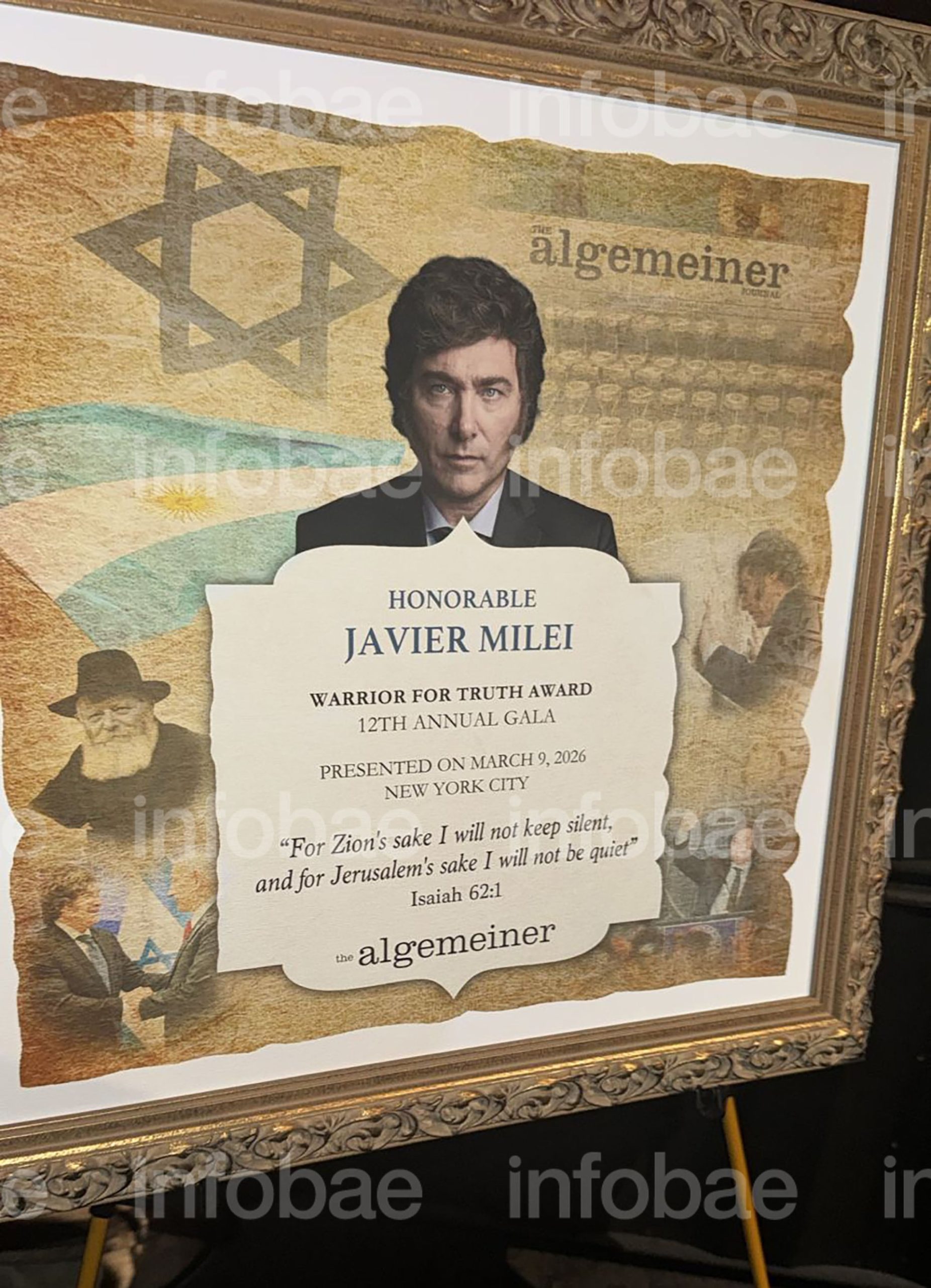 En la antesala de la distinción, la organización le dedicó un mensaje destacado en un recuadro, que decía: “Honorable Javier Milei, Warrior for Truth Award, 12th Annual Gala. Presented on March 9, 2026, New York City”. La dedicatoria incluyó un pasaje bíblico: “For Zion’s sake I will not keep silent, and for Jerusalem’s sake I will not be quiet” (Isaiah 62:1), junto a la firma de The Algemeiner.