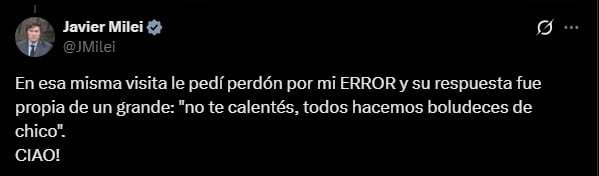 La intervención provocó una respuesta del Presidente con un dato revelador. “En la misma visita le pedí perdón por mi ERROR (sic) y su respuesta fue propia de un grande”, recordó Milei.
