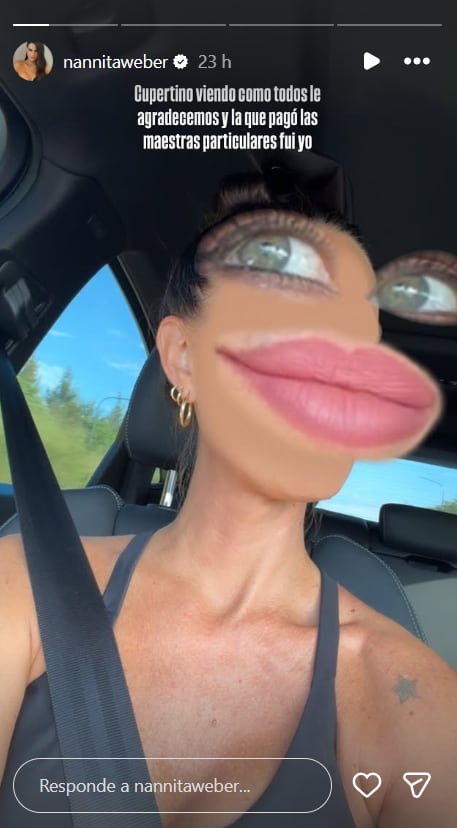 Natalie Weber volvió a mostrar el costado más descontracturado de su vida familiar con una serie de historias que compartió en sus redes sociales y que rápidamente generaron risas entre sus seguidores. Desde el asiento del auto y utilizando un llamativo filtro que exageraba sus ojos y labios, la modelo lanzó una frase que no pasó desapercibida: “Cupertino viendo cómo todos le agradecemos y la que pagó las maestras particulares fui yo”, escribió, en clara alusión al esfuerzo detrás del logro académico de su hija.