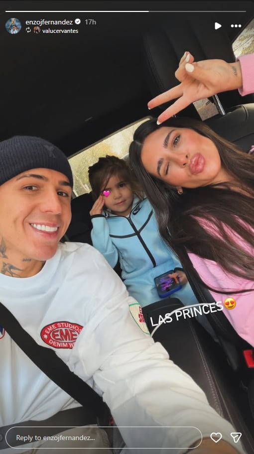 A través de sus historias de Instagram, Valentina mostró parte de su rutina londinense con publicaciones que despertaron ternura y complicidad en redes sociales. En la primera de las imágenes, se la ve dentro de un automóvil, posando para la cámara con el signo de la paz y un guiño, acompañada por su hija mayor, Olivia, y Enzo, quien sonríe desde el asiento del conductor. La imagen no tardó en ser replicada por el propio futbolista, quien sumó el emoji de enamorado y la frase: “Las princes”.