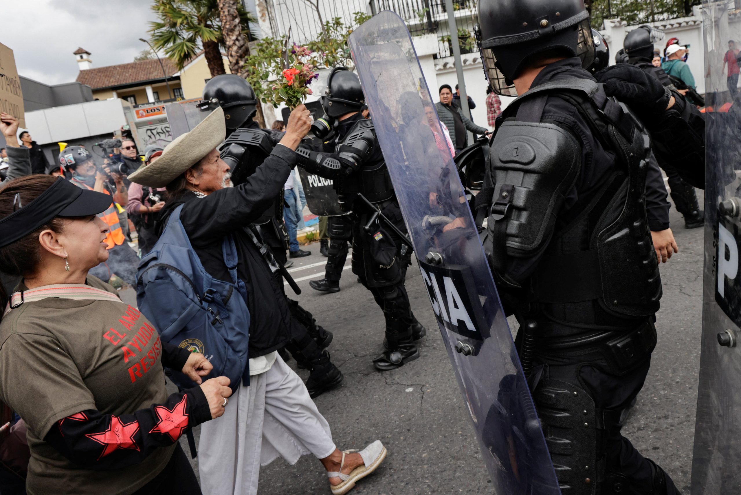 Un manifestante sostiene flores frente a agentes de policía mientras organizaciones indígenas y otros movimientos sociales convocan a una marcha pacífica de resistencia, en Quito, Ecuador, el 12 de octubre de 2025. REUTERS/Karen Toro