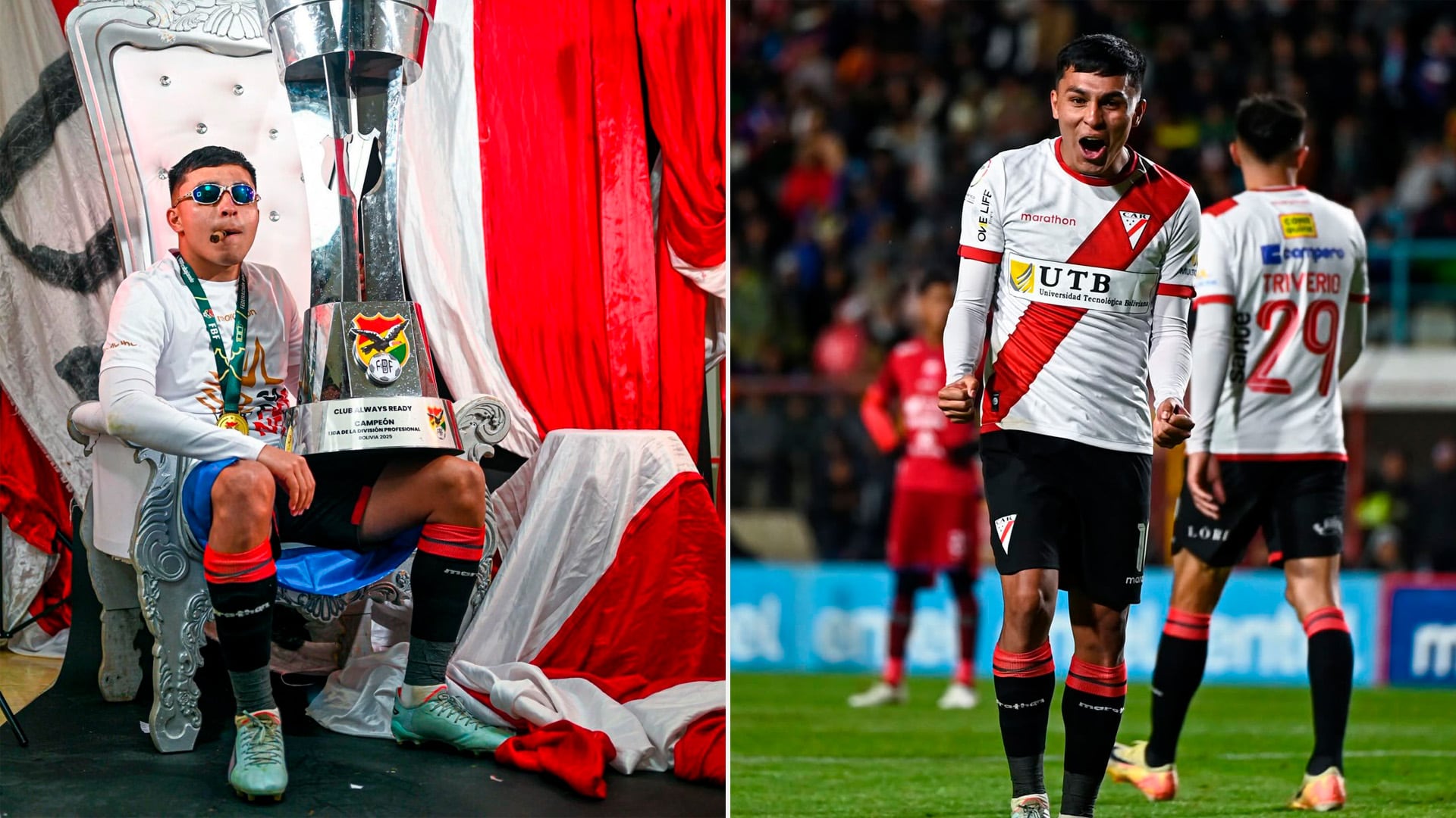 La particular imagen de quien fue uno de los goleadores del campeonato de Bolivia en la última temporada se hizo viral en las redes sociales: con el enorme trofeo en su regazo, sentado en un sillón de cuero, con ganas, la medalla colgada y fumando un habano.