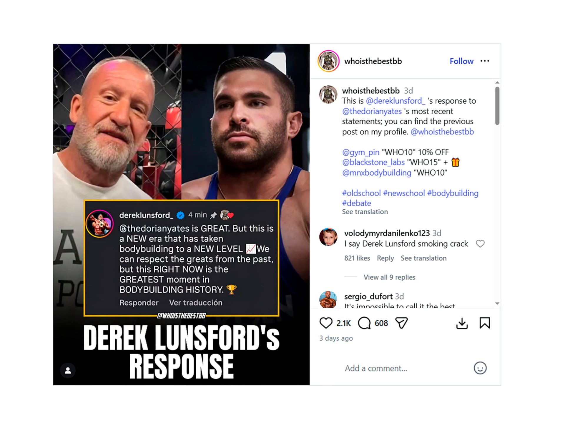Las respuestas en el ámbito del culturismo no se hicieron esperar. El actual campeón mundial de la categoría Open de Mr. Olympia 2025, Derek Lunsford, defendió el momento presente a través de sus redes sociales. “Dorian Yates es grande, pero esta es una nueva era que ha llevado al culturismo a un nuevo nivel. Podemos respetar a los grandes del pasado, pero este es el mejor momento de la historia del culturismo”, escribió el vigente campeón desde su cuenta de Instagram.