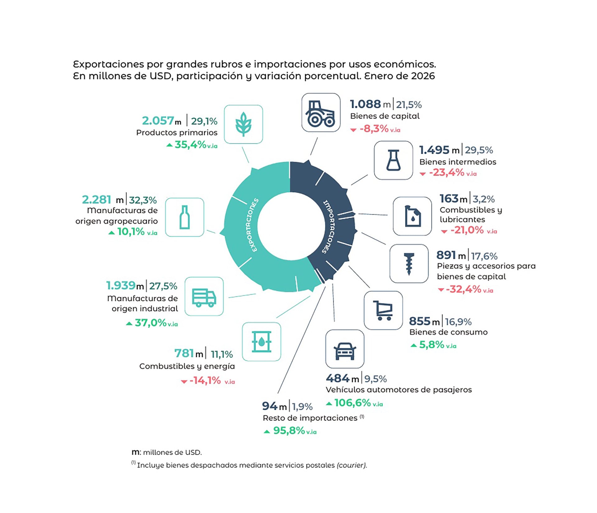 Durante el primer mes de 2026, el intercambio comercial argentino alcanzó un superávit de USD 1.987 millones, cifra que representa una mejora sustancial en comparación con el saldo positivo de USD 162 millones registrado en enero del año anterior. De acuerdo con el informe oficial del Instituto Nacional de Estadística y Censos (Indec), este resultado consolida una tendencia favorable al marcar el vigésimo sexto mes consecutivo con saldo positivo para la balanza comercial del país. El valor total del intercambio comercial, que suma exportaciones e importaciones de bienes, ascendió a USD 12.128 millones, lo que implicó un incremento interanual del 3,9%.
