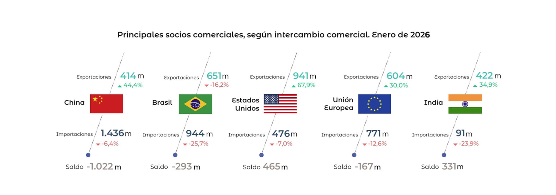 En materia de socios comerciales, China se posicionó como el principal origen de las importaciones y el cuarto destino de las exportaciones. El intercambio con el país asiático dejó un déficit bilateral de USD 1.022 millones, con exportaciones por USD 414 millones e importaciones por USD 1.436 millones. Brasil, por su parte, generó un déficit de USD 293 millones para la Argentina, producto de ventas por USD 651 millones y compras por USD 944 millones.