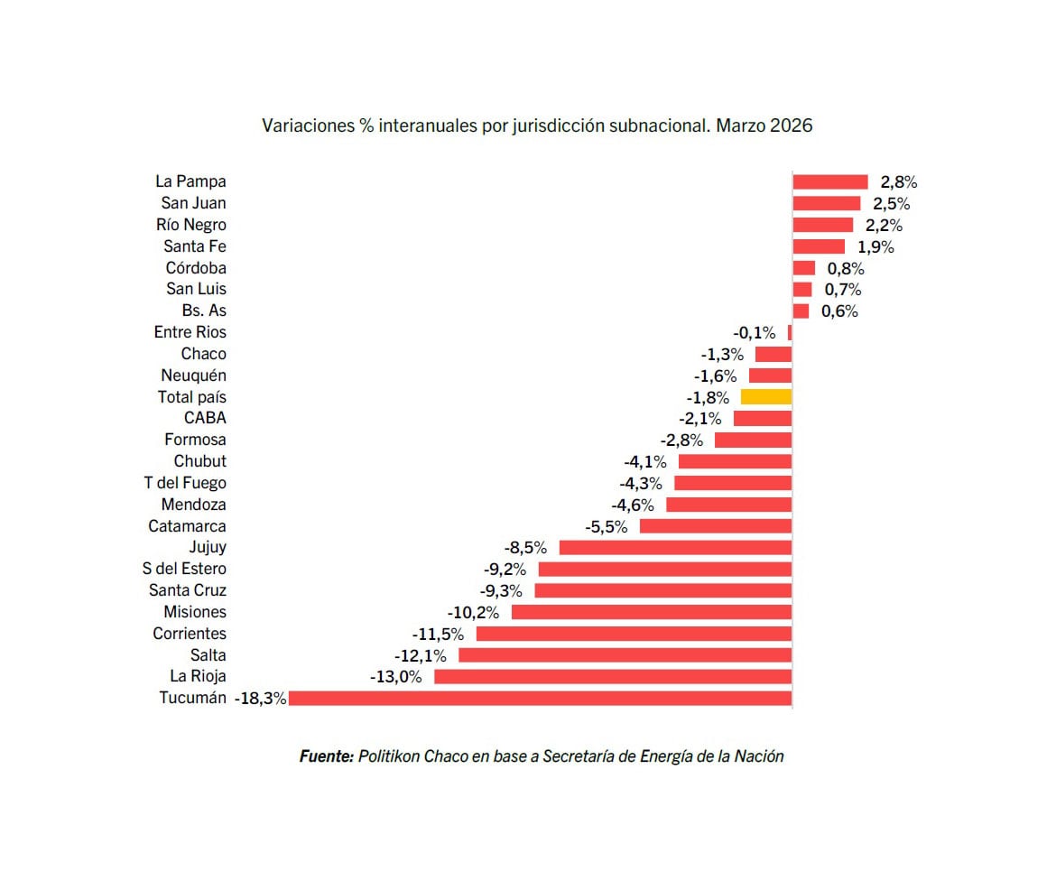 En contraste, las bajas más pronunciadas se observaron en el norte del país. Tucumán registró una caída del 18,3%, seguida por La Rioja (-13,0%) y Salta (-12,1%). Otras provincias con descensos relevantes fueron Corrientes (-11,5%), Misiones (-10,2%) y Santiago del Estero (-9,2%).