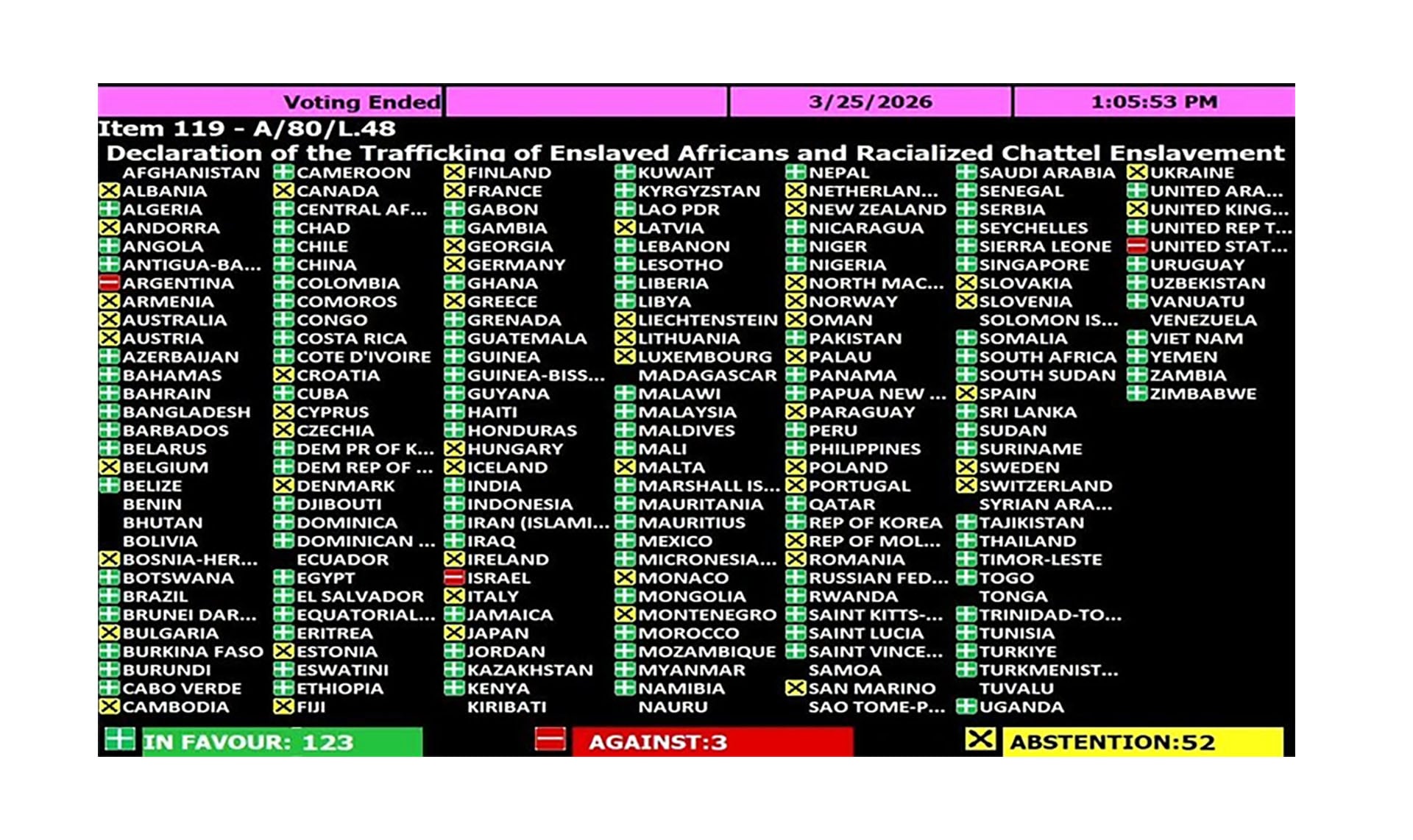 El documento fue promovido por Ghana y aprobado con 123 votos a favor, 52 abstenciones y tres votos en contra. La resolución reconoce la trata y esclavitud de personas africanas como “el crimen de lesa humanidad más grave”, y ratifica la persistencia de la discriminación, el trauma y la explotación económica que continúan afectando a africanos y afrodescendientes en distintos continentes.