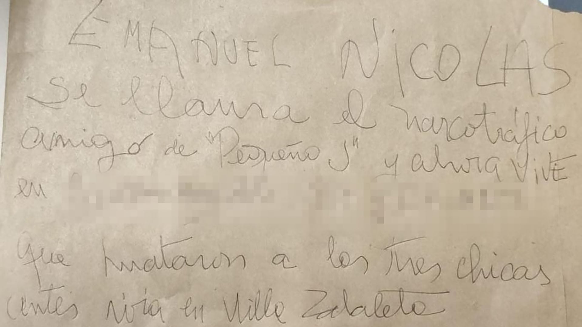 “EMANUEL NICOLÁS se llama el narcotráfico de Pequeño J”, dice, literal, el breve texto escrito por partes con letra imprenta y otros con cursiva. Luego, brinda un domicilio localizado en el barrio porteño de Barracas, en el que se estaría ocultando la mano derecha del principal sospechoso, la cual no es revelada por este medio para preservar datos sensibles de la investigación.