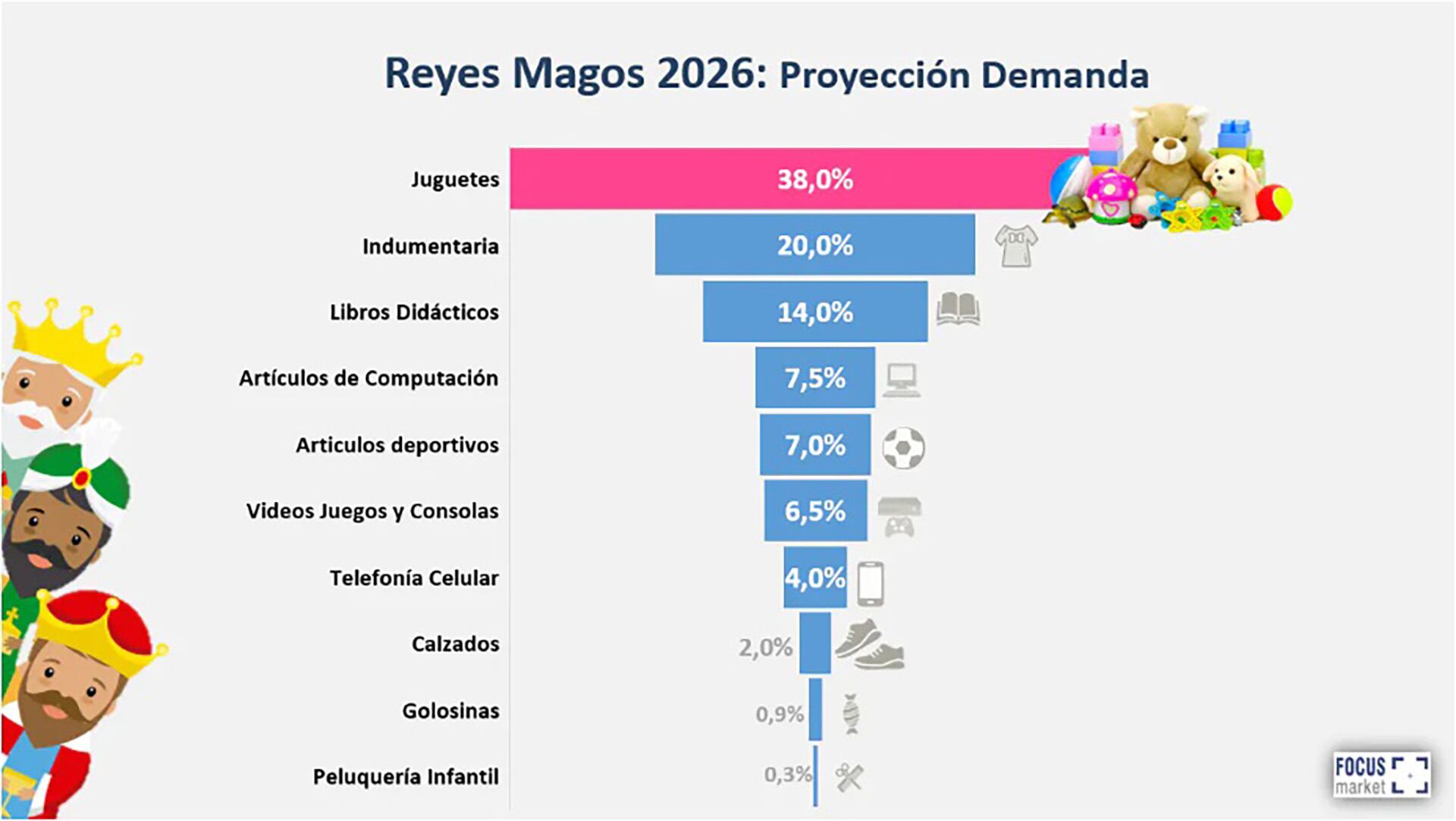 De acuerdo con el relevamiento, el 38% de los regalos de Reyes son juguetes. Completan el podio de demanda la indumentaria (20%) y los libros didácticos (14%). Más atrás aparecen los artículos de computación (7,5%) y los artículos deportivos (7,5%), entre otras categorías.
