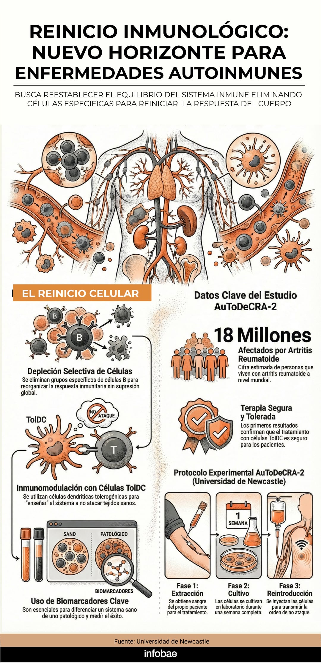 Esta propuesta, desarrollada por el doctor John Isaacs, profesor de la Universidad de Newcastle, en el Reino Unido, fue publicada hoy en el artículo Reinicio inmunológico y reajuste inmunológico: ¿se acerca la cura?” en Nature Reviews Rheumatology. El prestigioso cardiólogo y divulgador científico Eric Topol destacó el enfoque, que compartió en su cuenta de X, describiéndolo como la posibilidad de “reiniciar el sistema inmunológico mediante la eliminación de células B, como reiniciar una computadora, para lograr curas frente a enfermedades autoinmunes”.