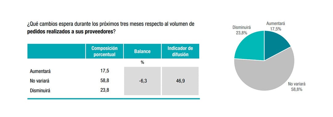 Otro de los puntos centrales del relevamiento es la evolución esperada del volumen de pedidos realizados a proveedores. Ante la pregunta “¿Qué cambios espera durante los próximos tres meses respecto al volumen de pedidos realizados a sus proveedores?”, el 58,8% de las empresas respondió que “no variará”, el 17,5% que “aumentará” y el 23,8% que “disminuirá”.