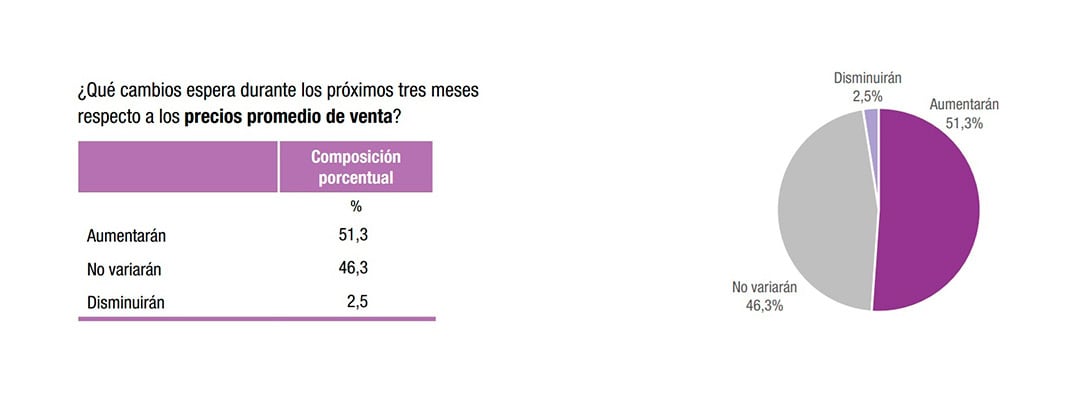 En relación con los precios promedio de venta, más de la mitad de las empresas anticipa incrementos para los próximos meses. Frente a la pregunta “¿Qué cambios espera durante los próximos tres meses respecto a los precios promedio de venta?”, el 51,3% respondió que “aumentarán”, el 46,3% que “no variarán” y apenas el 2,5% que “disminuirán”.