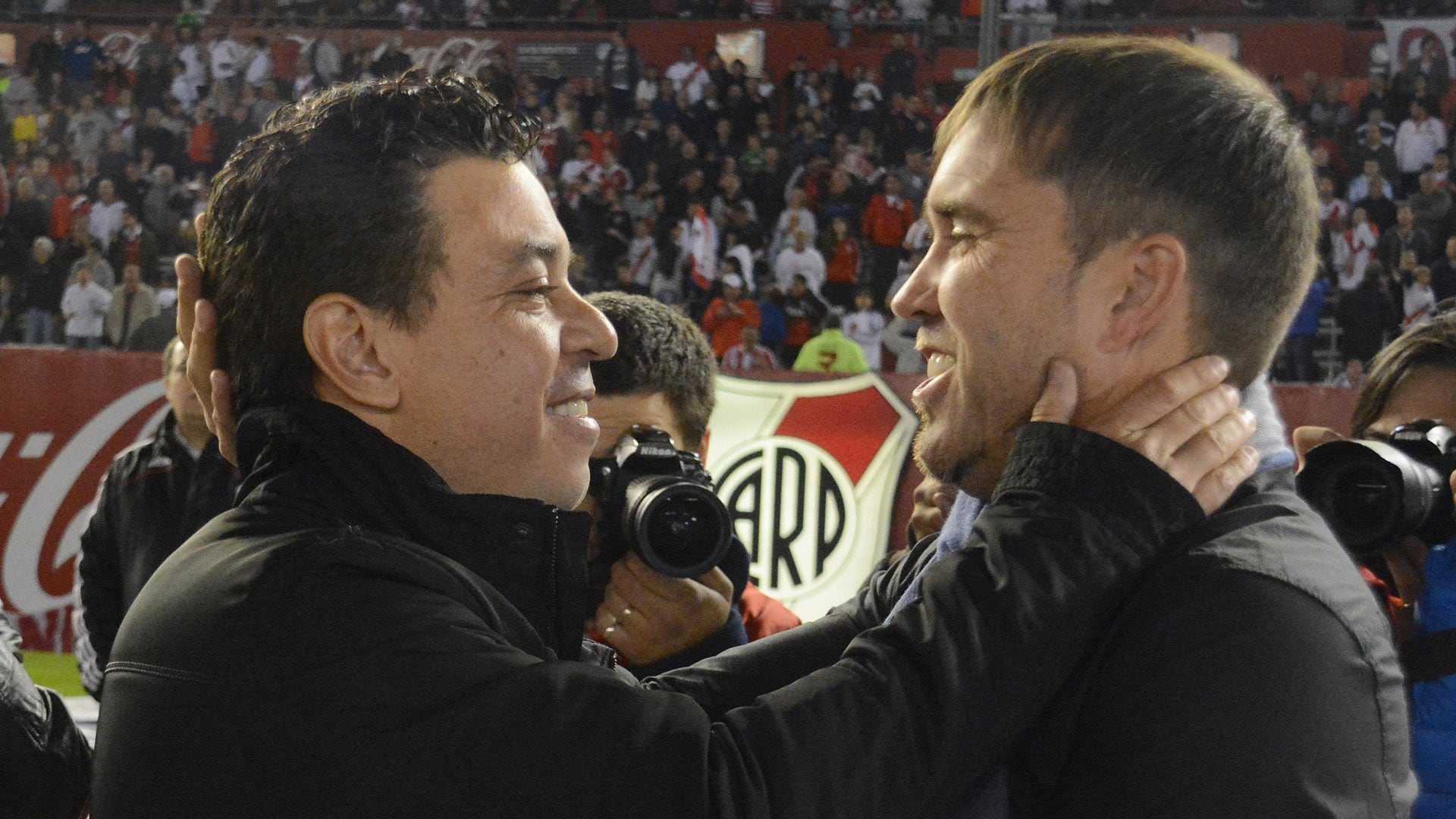 Marcelo Gallardo y Eduardo Coudet comparten un abrazo sonriente durante el partido entre River Plate y Rosario Central en mayo de 2015. (Foto Baires)