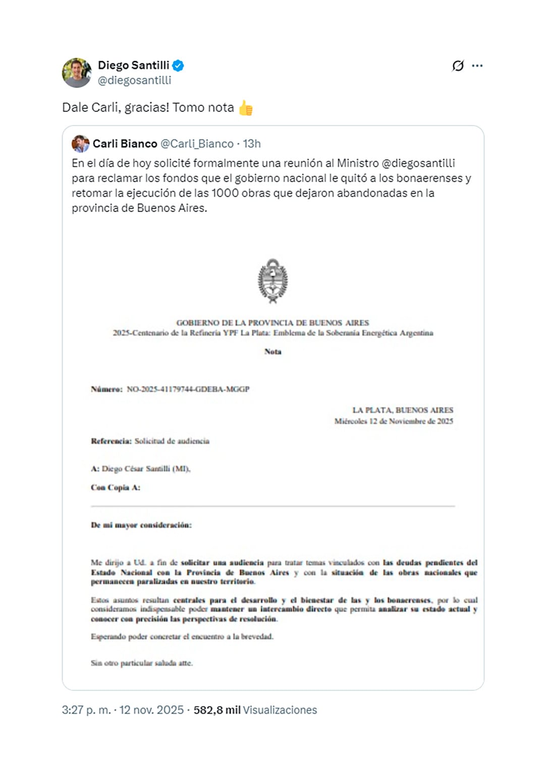 Bianco había compartido el requerimiento formal públicamente para poder retomar la ejecución de Nación, por las “1000 obras que dejaron abandonadas”. “Estos asuntos resultan centrales para el desarrollo y el bienestar de los bonaerenses, por lo cual consideramos indispensable poder mantener un intercambio directo que permita analizar su estado actual y conocer con precisión las perspectivas de resolución”, dijo el ministro de Kicillof. A la publicación adjuntó la imagen de la solicitud de audiencia presentada ante el titular del Ministerio del Interior.