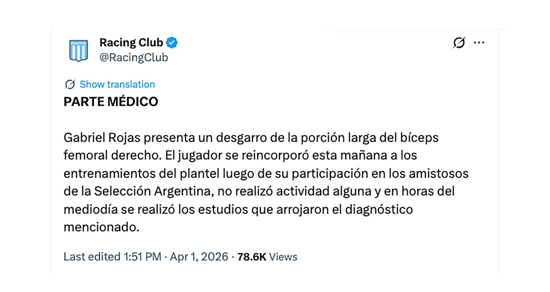 El parte médico oficial puntualizó este miércoles: “Gabriel Rojas presenta un desgarro de la porción larga del bíceps femoral derecho. El jugador se reincorporó esta mañana a los entrenamientos del plantel luego de su participación en los amistosos de la Selección Argentina, no realizó actividad alguna y en horas del mediodía se realizó los estudios que arrojaron el diagnóstico mencionado”. Posiblemente, además del derby frente al Rojo, el ex San Lorenzo no pueda volver a jugar en fase regular del Torneo Apertura 2026.