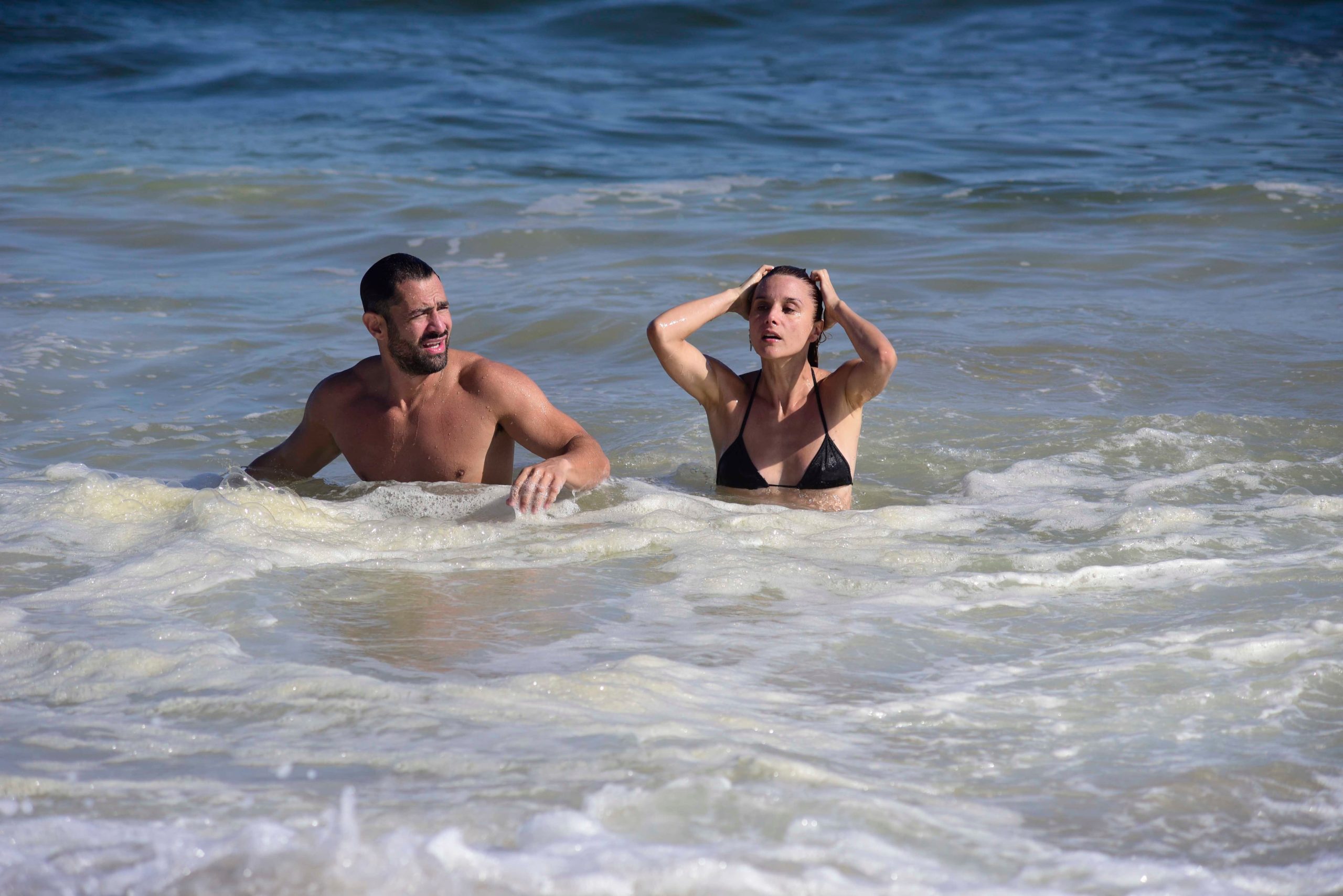En una de las postales más vívidas, ambos se sumergen en el mar. Noe eligió una bikini negra de líneas simples, con corpiño triangular y bombacha lisa, sin maquillaje ni accesorios, con el pelo mojado y suelto. La naturalidad es su sello. López optó por una malla short estampada, con colores vivos y espíritu relajado, sumando un toque divertido a su look. En el agua, él sonríe, espontáneo, mientras ella se lleva las manos a la cabeza, disfrutando de la frescura y el juego con las olas.