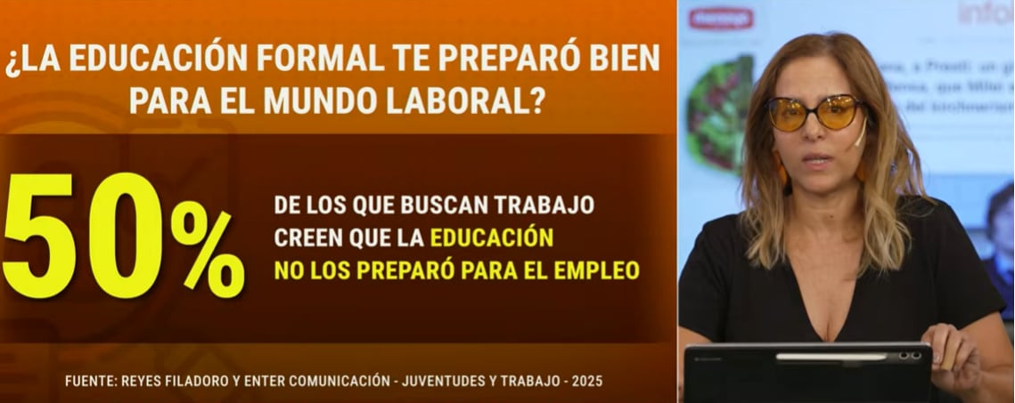 La periodista explicó que llamó su atención una estadística puntual: apenas el 16% de los jóvenes de 18 a 35 años declara querer un trabajo en relación de dependencia, una cifra que resulta casi impensada para el imaginario de generaciones pasadas. “Era el sueño de nuestra generación y, sobre todo, de la anterior. Ahora, la mitad de quienes buscan empleo consideran que la educación formal no los preparó para trabajar, y eso los deja fuera del sistema”, agregó. La encuesta de Reyes Filadoro, da cuenta de un fenómeno profundo: la transformación del “deseo laboral” clásico hacia otras formas de desempeño.