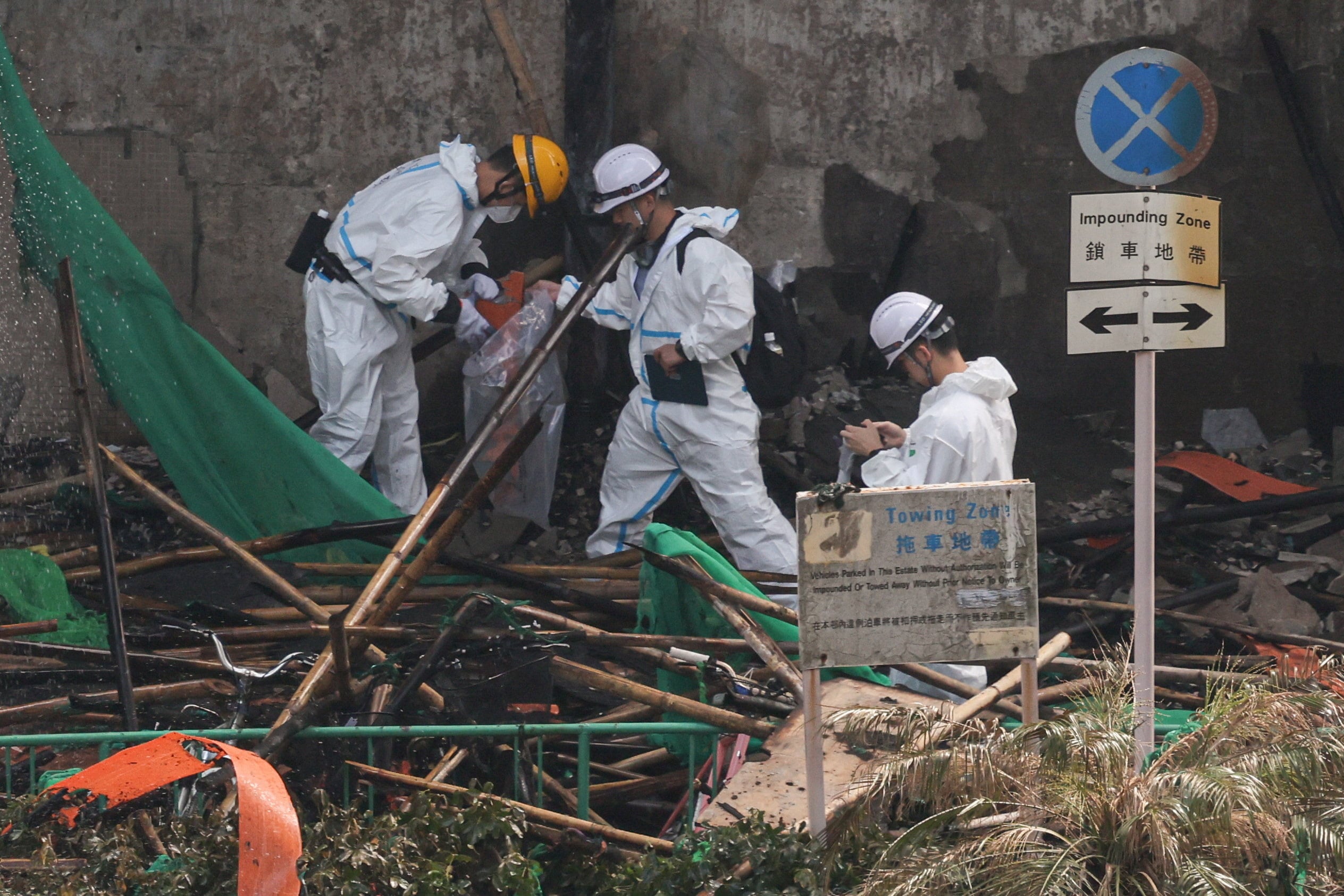 Agentes de policía con trajes de protección recogen muestras en el lugar de un bloque residencial dañado por el fuego en el complejo de viviendas Wang Fuk Court, luego de un incendio mortal el miércoles, en Tai Po, Hong Kong, China, el 29 de noviembre de 2025. REUTERS/Tyrone Siu