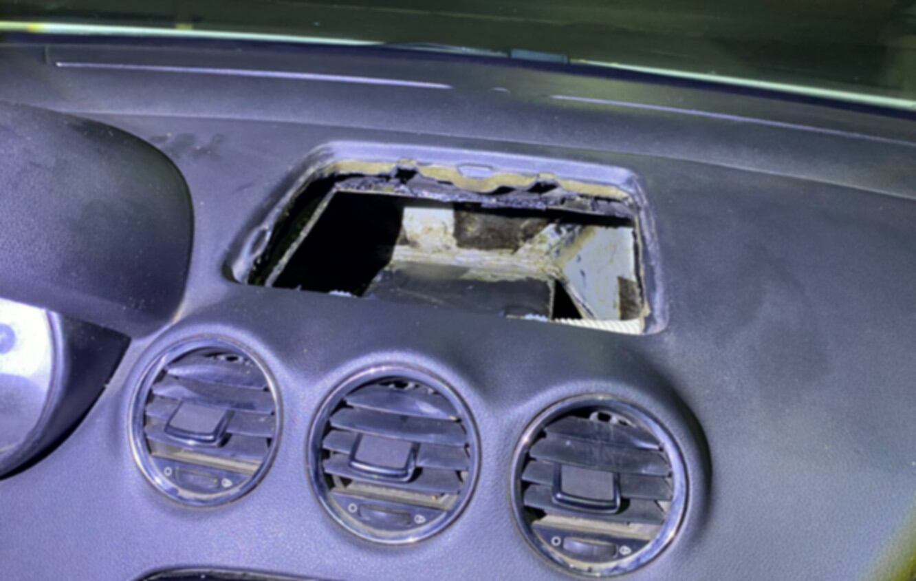 Los agentes detectaron un fuerte olor a pegamento que salía de un Peugeot 408. Al inspeccionar el vehículo, hallaron 45 paquetes de cocaína ocultos en el sistema del aire acondicionado y otros 18 paquetes adicionales escondidos en los zócalos bajo los asientos del conductor y el acompañante.