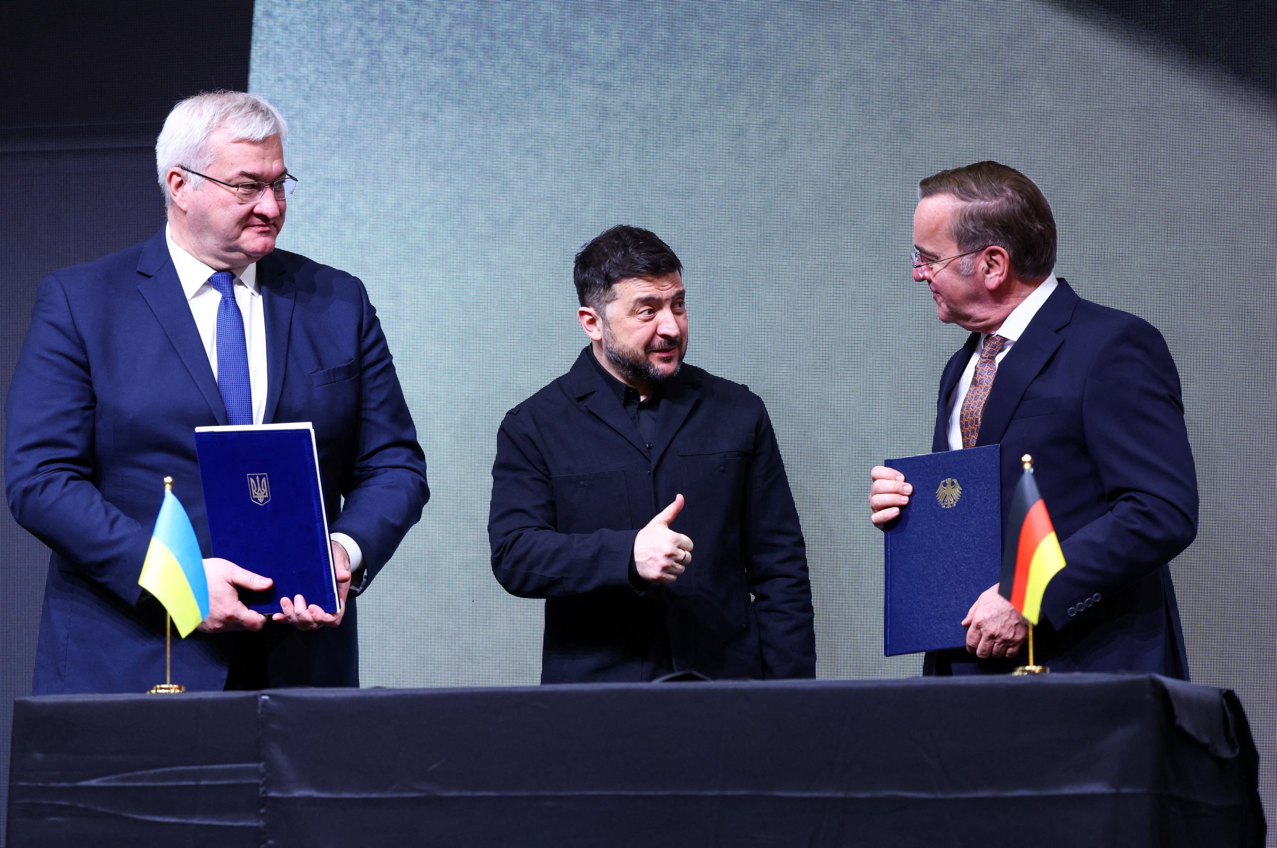 En otro gesto de apoyo al país invadido por Rusia, Zelensky recibió este viernes el primer dron ucraniano fabricado en Alemania, entregado por el ministro de Defensa alemán, Boris Pistorius.