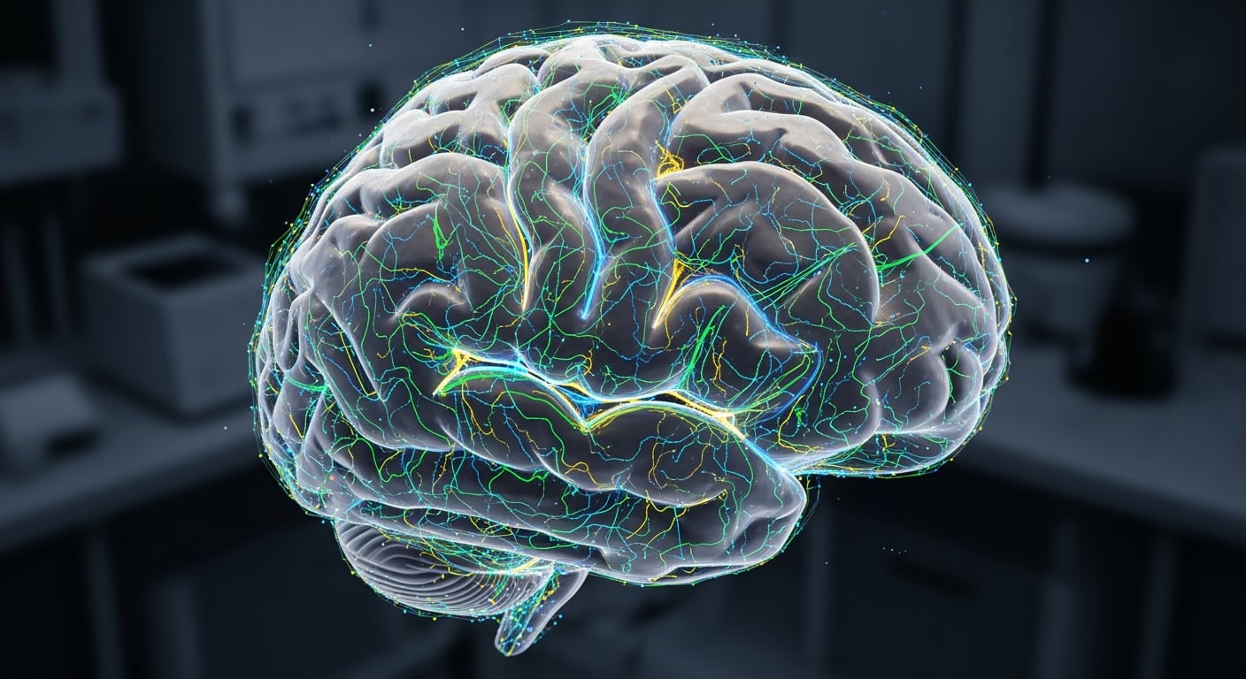 Imagen generada por inteligencia artificial que muestra un cerebro humano digitalizado, resaltando redes neuronales con líneas de colores sobre un fondo de laboratorio. Este tipo de visualización promueve avances en neurociencia y tecnología, permitiendo entender mejor el funcionamiento y la interacción de las neuronas en el cerebro. (Imagen Ilustrativa Infobae)