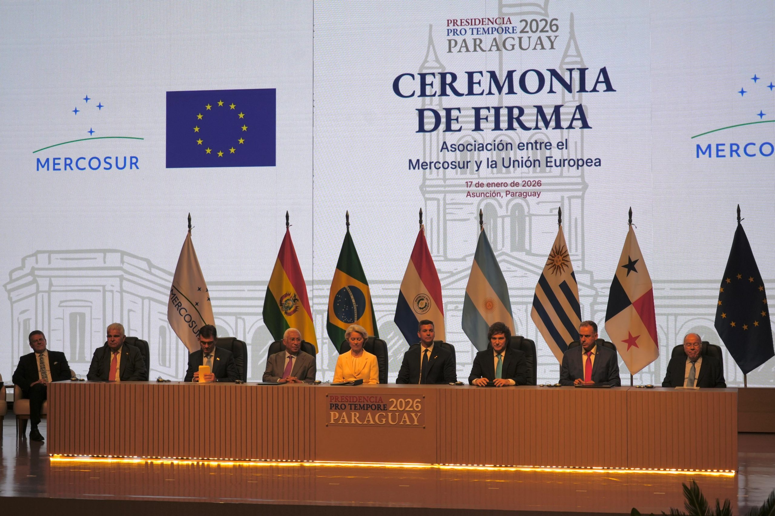 La presidenta de la Comisión Europea, Ursula von der Leyen, estrecha la mano del presidente de Paraguay, Santiago Peña, con el presidente del Consejo Europeo, Antonio Costa, y el presidente de Argentina, Javier Milei, a su lado, el día en que las autoridades de la Unión Europea y del bloque sudamericano Mercosur firman un acuerdo de libre comercio, poniendo fin a más de 25 años de negociaciones, en Asunción, Paraguay, el 17 de enero de 2026. REUTERS/Cesar Olmedo