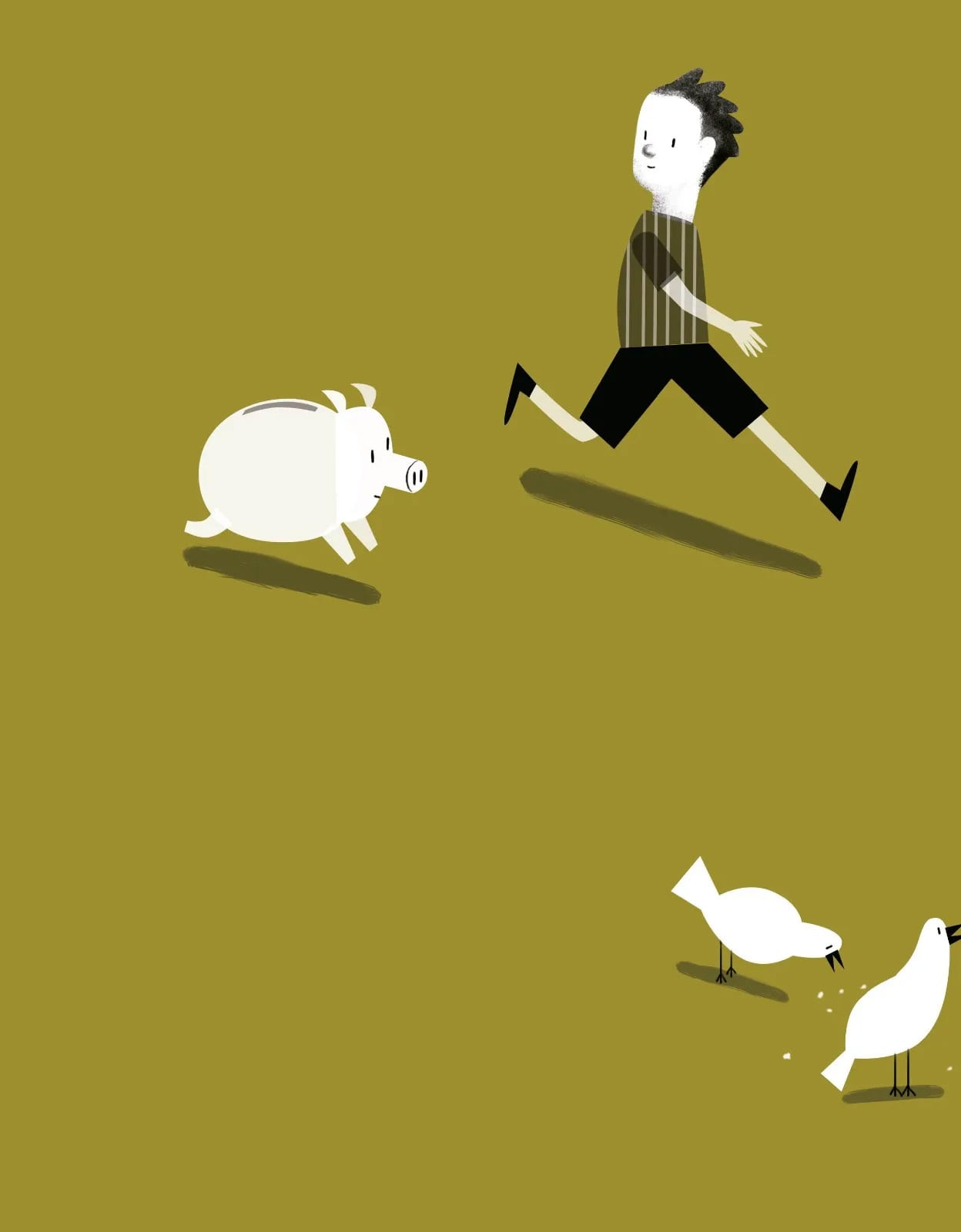 Desplegado en el espacio de la doble página, el tono del libro es juguetón pero lo que esas imágenes señalan no tienen nada de ligereza. A través del arte visual y la metáfora del chanchito alcancía (una figura que va de la ternura a lo siniestro), advertimos cómo el dinero y el mercado se imponen desde la infancia, primero como una fuerza arrolladora que promete cumplir los sueños y promover el progreso y tranquilidad para el futuro, para luego convertirse en una obsesión fantasma. Una fijación que sobrevuela vínculos y proyectos personales y laborales y que provoca una competencia enferma, pánico a perder lo mucho o poco que se tiene y, también, una soledad demoledora.