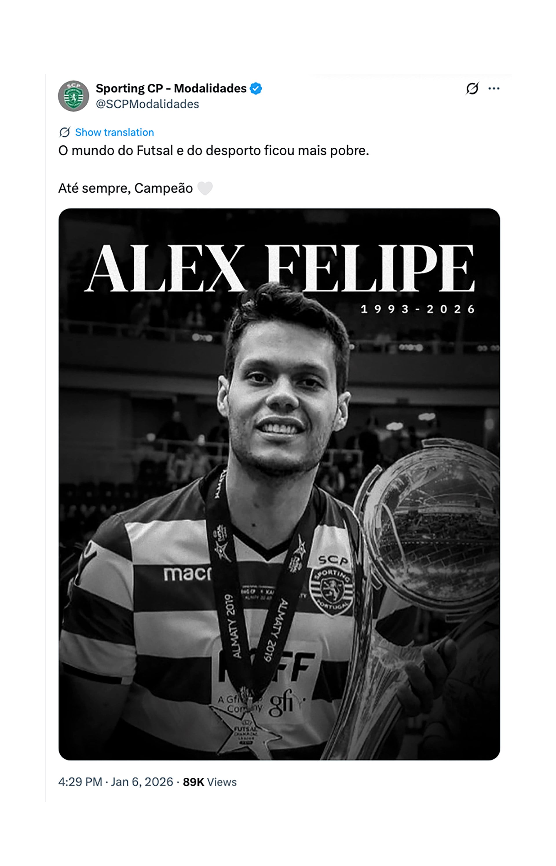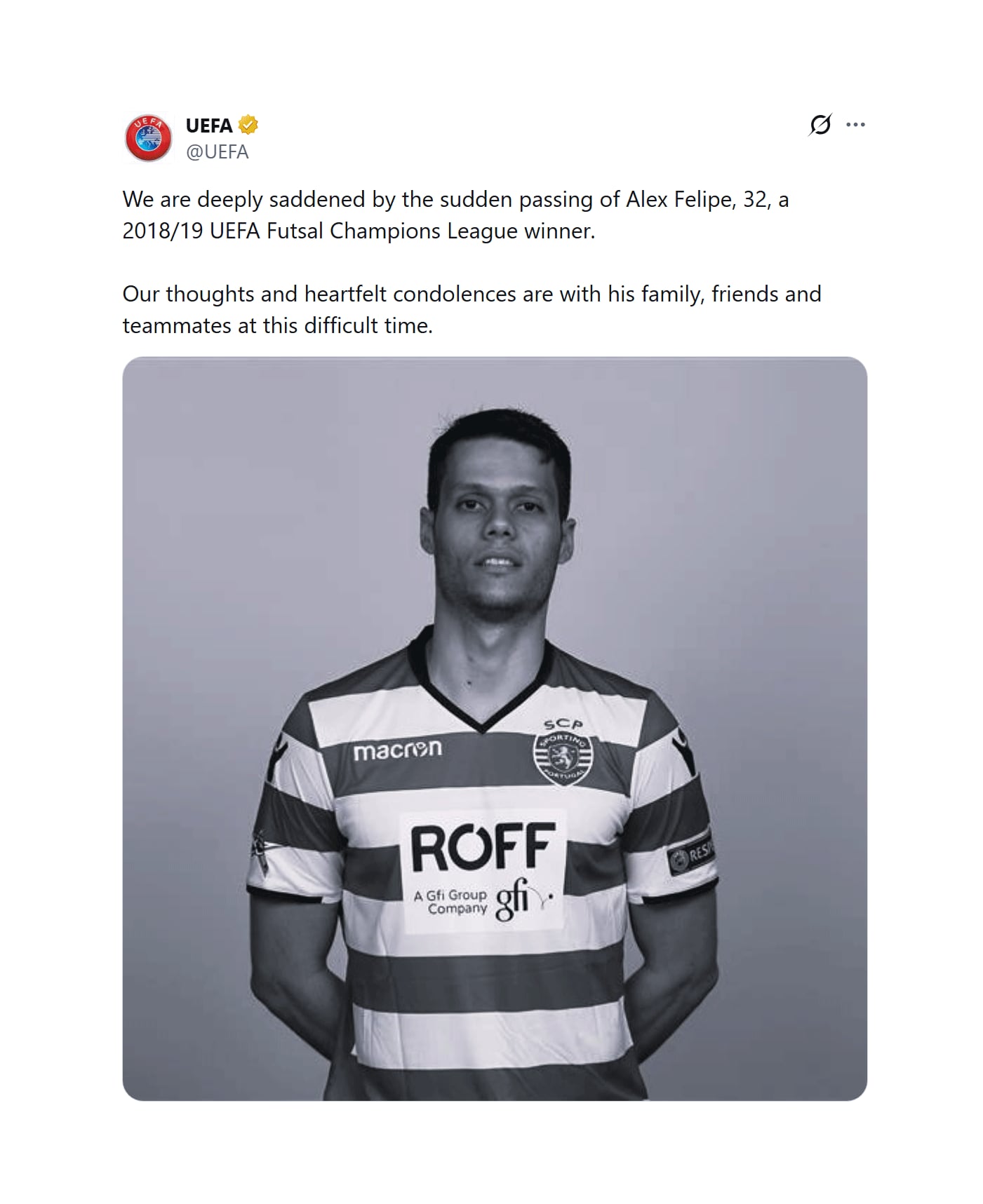 La UEFA también se pronunció tras conocer la trágica noticia: “Lamentamos profundamente el repentino fallecimiento de Alex Felipe, de 32 años, campeón de la UEFA Futsal Champions League 2018/19. Nuestro más sentido pésame a su familia, amigos y compañeros en este difícil momento».
