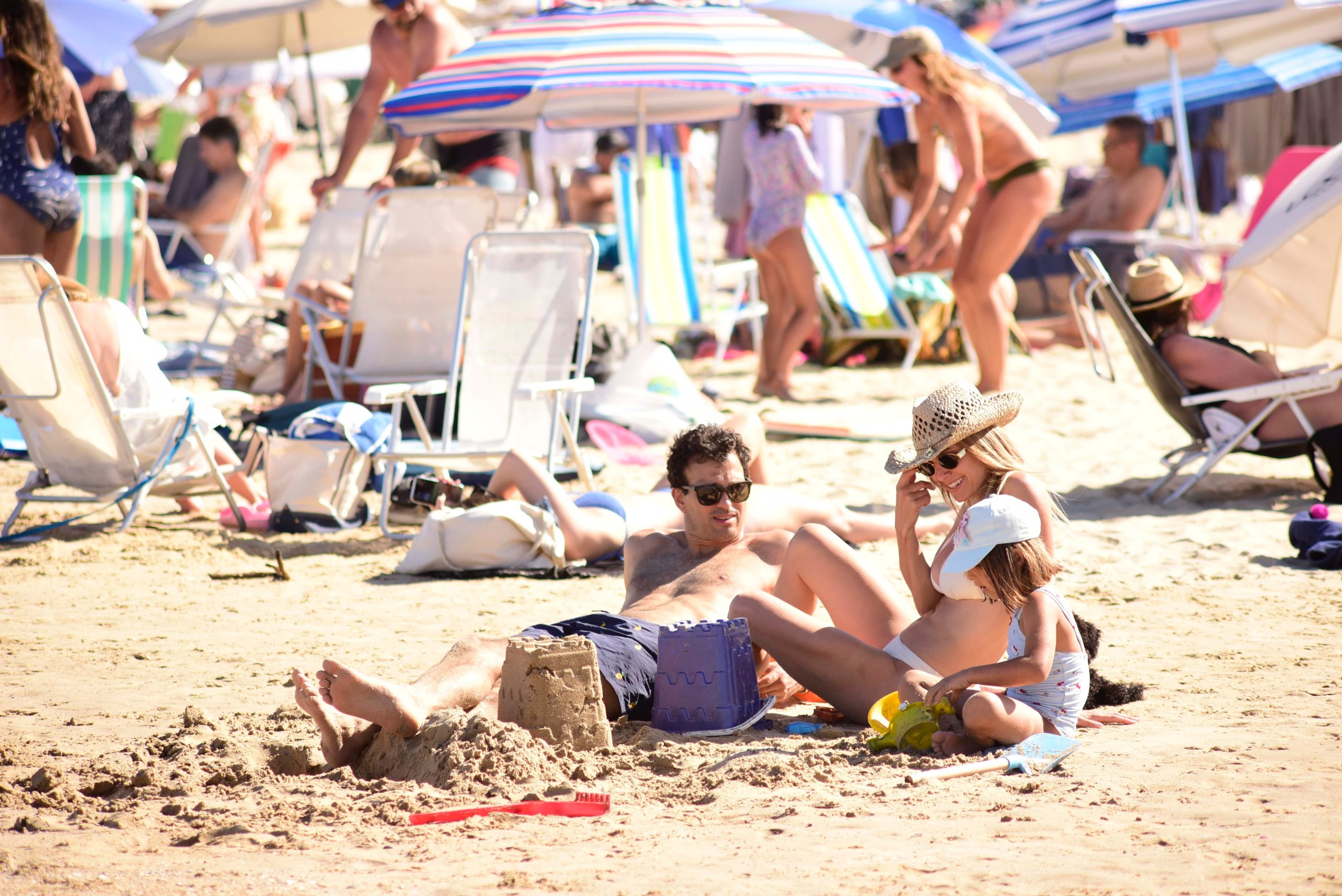 El entorno no cede: sombrillas azules, blancas, rayadas; reposeras de metal y tela; bolsos playeros repletos de objetos; bebidas frescas y ropa colgada en percheros improvisados. Un fondo de turistas y locales se entremezcla, algunos sentados, otros de pie, todos disfrutando de la jornada. ¿Quién puede resistirse a este verano que acaba de comenzar?